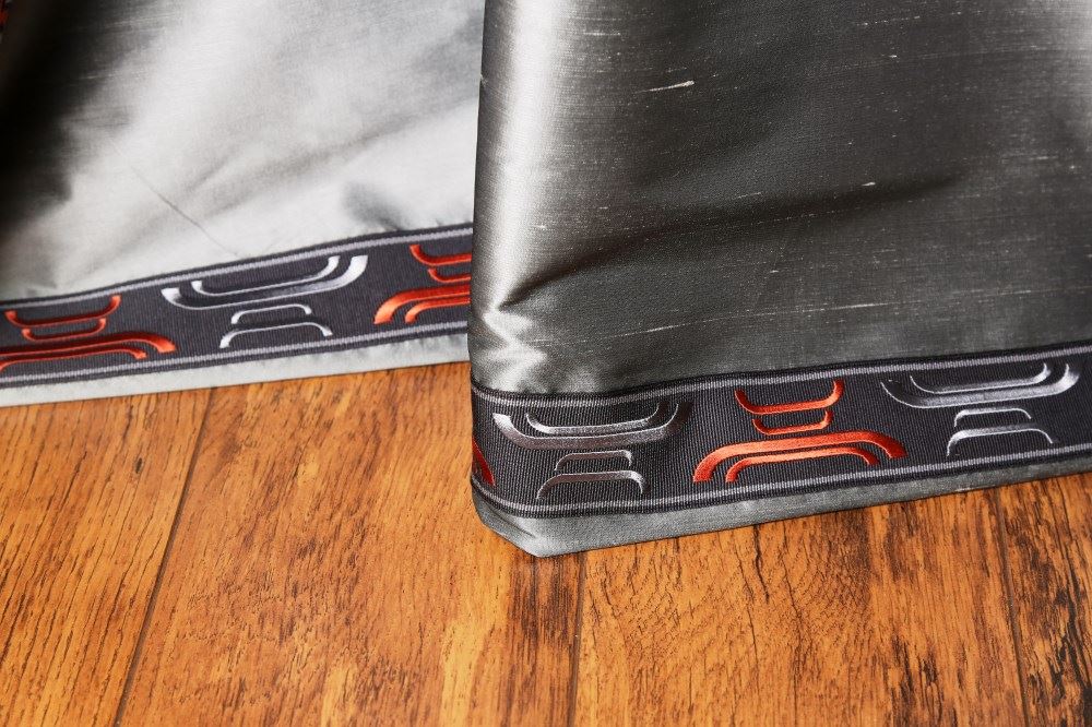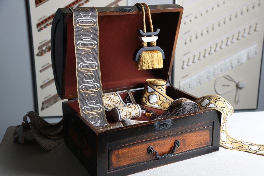 我們依據(jù)梅花窗的圖案,設(shè)計了兩款帶子,搭配窗簾和抱枕,把江南唯美的文化氛圍,通過與布藝的結(jié)合置入中式家居。